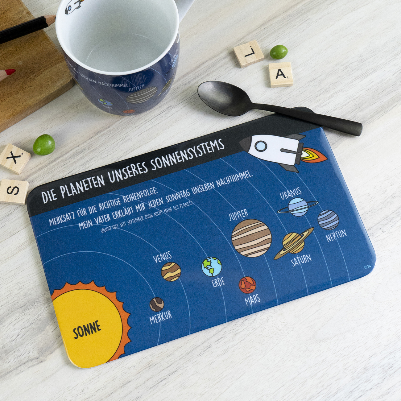 Das Frühstücksbrettchen Sonnensystem erklärt auf anschauliche Weise die Anordnung der Planeten im All. Mit einem ganz einfach Merksatz kannst du dir die Namen von den Planeten merken: MEIN VATER ERKLÄRT MIR JEDEN SONNTAG UNSEREN NACHTHIMMEL. Ganz einfach kann man sich die Namen von Merkur, Venus, Erde, Mars, Jupiter, Saturn, Uranus und Neptun merken und die Sonnen selber und der Mond dürfen da natürlich nicht fehlen. Schon am Frühstückstisch kannst in Gedanken in die Weiten des Universums eintauchen.