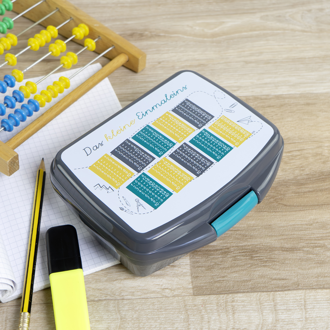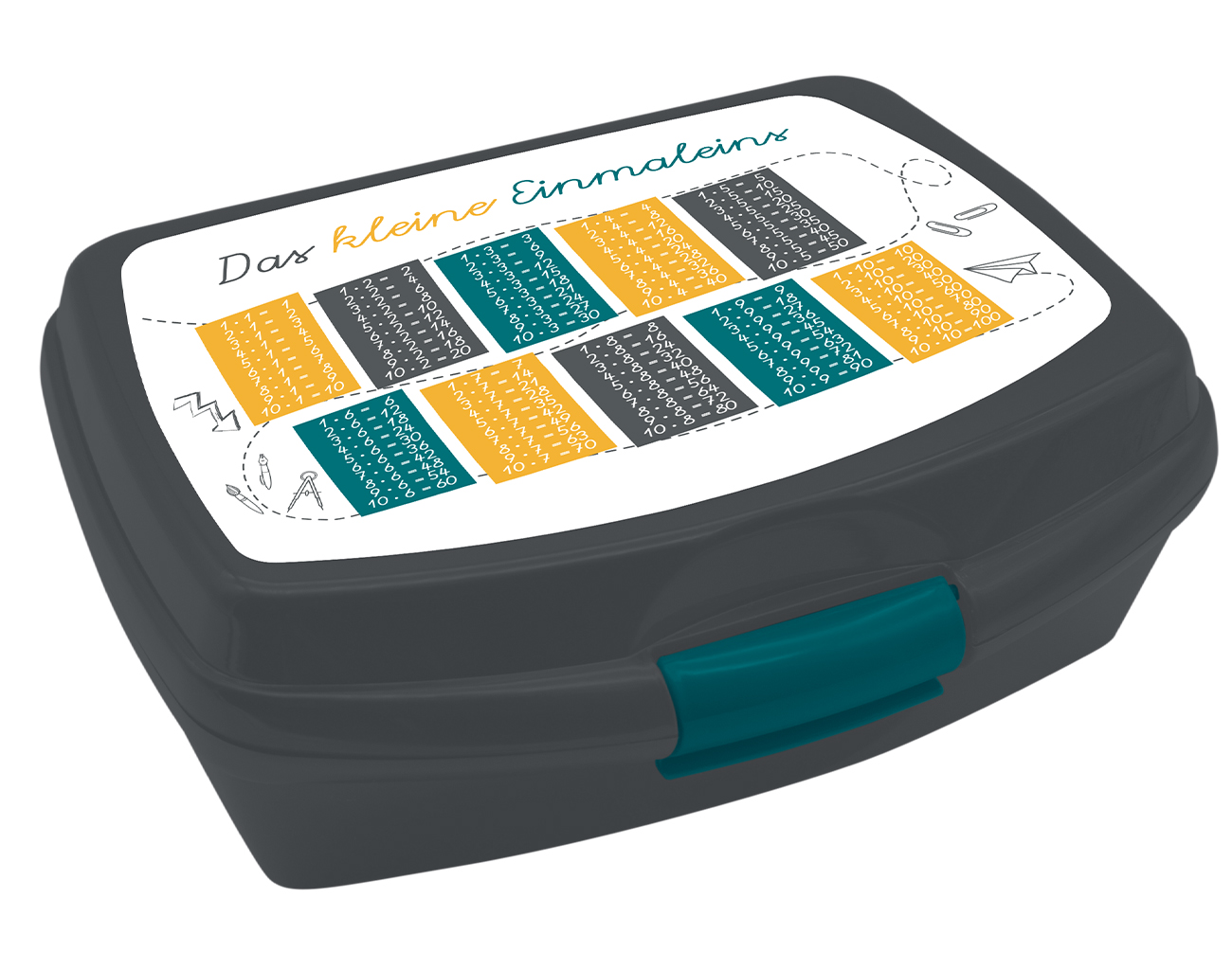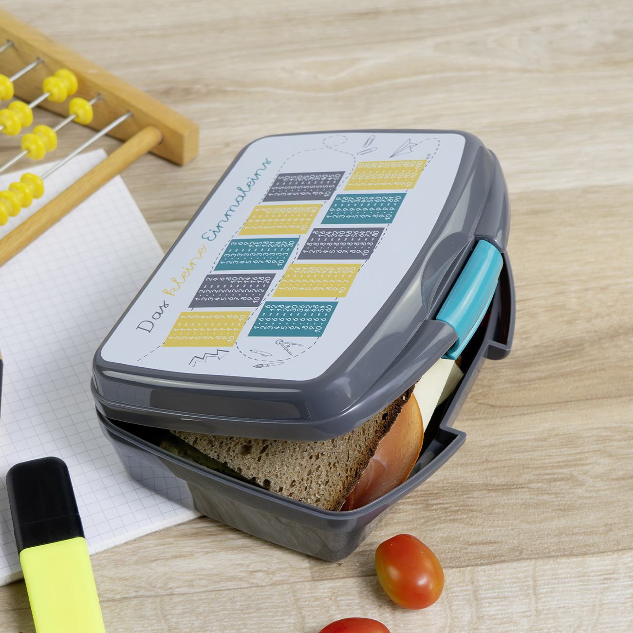 Ganz gleich, ob für einen Ausflug ins Grüne oder die große Pause in der Schule: Mit der Brotdose und dem Kleinen 1x1 können die jungen Schüler ganz nebenbei das Rechnen üben. Das große Fach mit 600 ml Fassungsvermögen bietet genug Platz für ein Pausenbrot und ein paar Gemüsesnacks. Dank des seitlichen Clip-Verschlusses lässt sich die Dose ganz leicht öffnen und schließen.