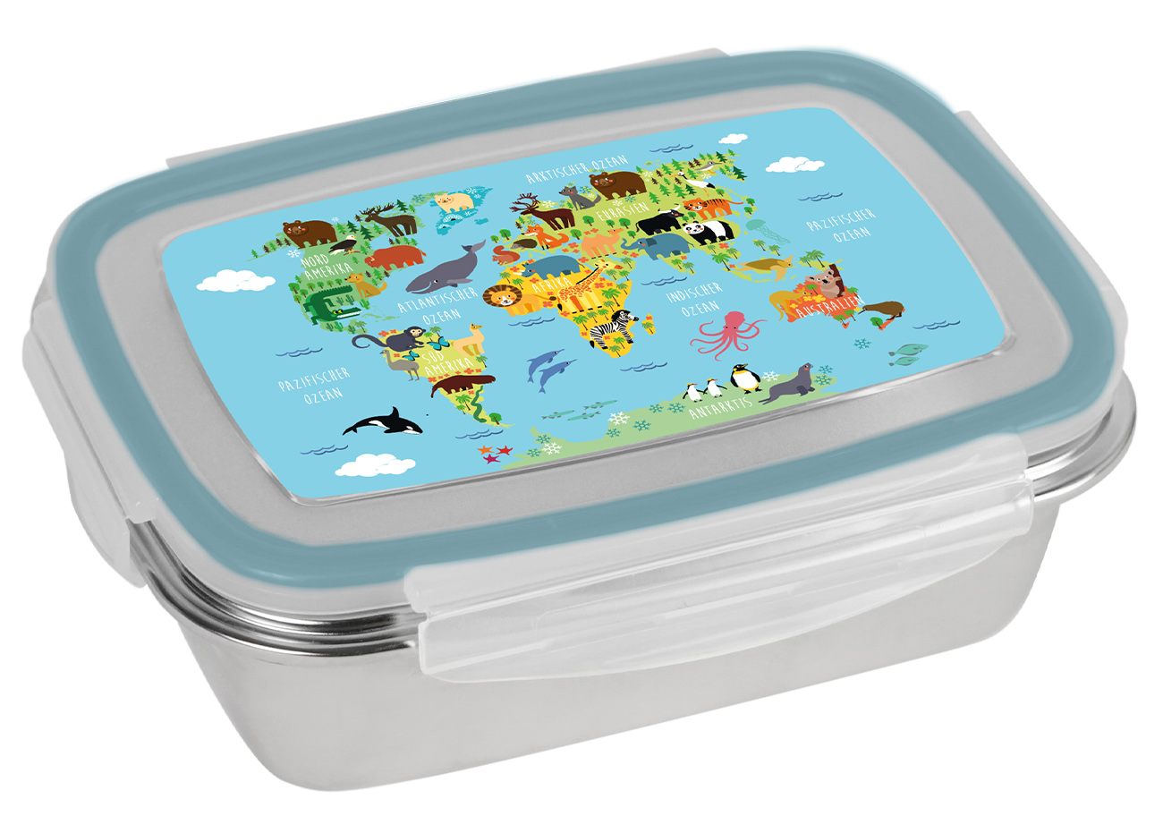 On the 850ml stainless steel Where Do You Come From lunch box, little zoologists can discover which region the animals come from. With their finger on the lid of the stainless steel box, the young adventurers can find out which parts of the world the animals are native to. The practical stainless steel container has a lid with a four-sided clip closure and a rubber lip all around to prevent your lunch from drying out.