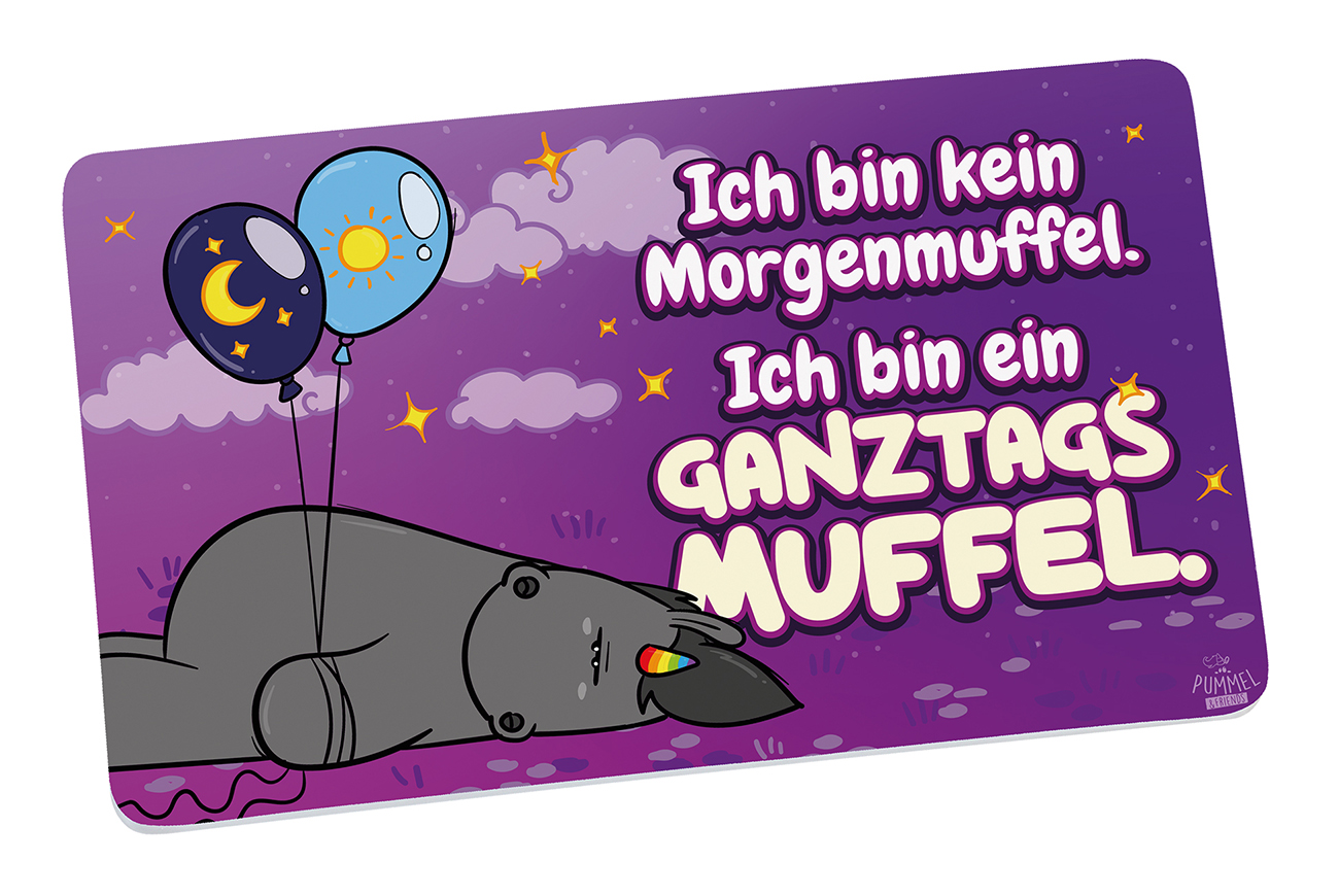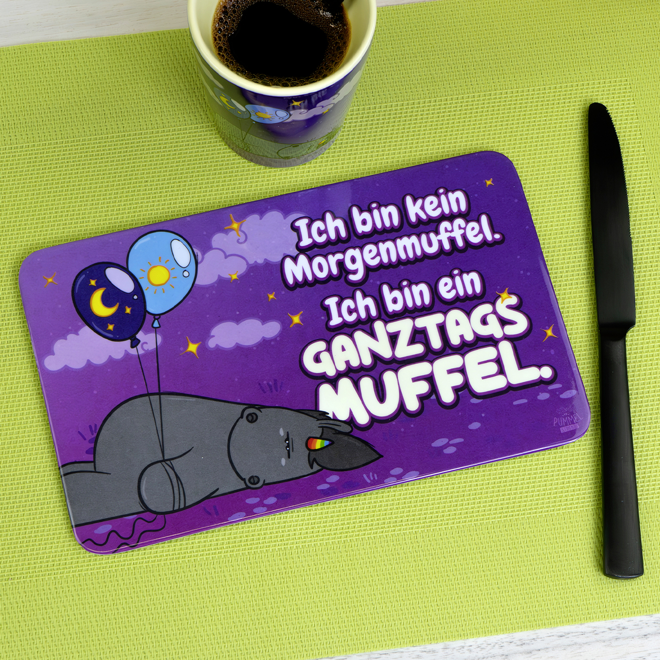 Bist du auch wie das muffelige Grummeleinhorn? Dann ist dieses Frühstücksbrettchen genau das richtige für dich. Als Ganztagsmuffel versprühst du nicht nur am Frühstückstisch deinen besonders muffeligen Charme. Das Melaminbrettchen mit lilafarbenem Untergrund ist perfekt für deine Schnitte Brot am Morgen und zaubert so manchem Morgenmuffel doch noch ein Lächeln ins Gesicht. Die praktischen Antirutschnoppen auf der Unterseite halten das Brettchen bei kleinen Schnippelarbeiten sicher am Platz.