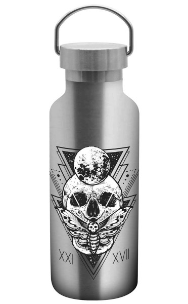 Die Isolierflasche Skull Mystic 500ml Edelstahl ist doppelwandig und vakuumisoliert. Die Flasche trägt auf einer Seite ein mystisches Motten Motiv und auf der anderen Seite einen Totenkopf. Die silberne Totenkopf Trinkflasche ist der perfekte Begleiter im Alltag. Sie hält Getränke bis zu 24 Stunden kalt und 12 Stunden warm. Die Silikondichtung im Deckel ist aus 100% Silikon und BPA-frei, dadurch kannst du dir sicher sein, diese Flasche läuft nicht aus. Der schwarze Silikonring am Deckel sorgt für einen guten Grip beim Öffnen und Schließen.