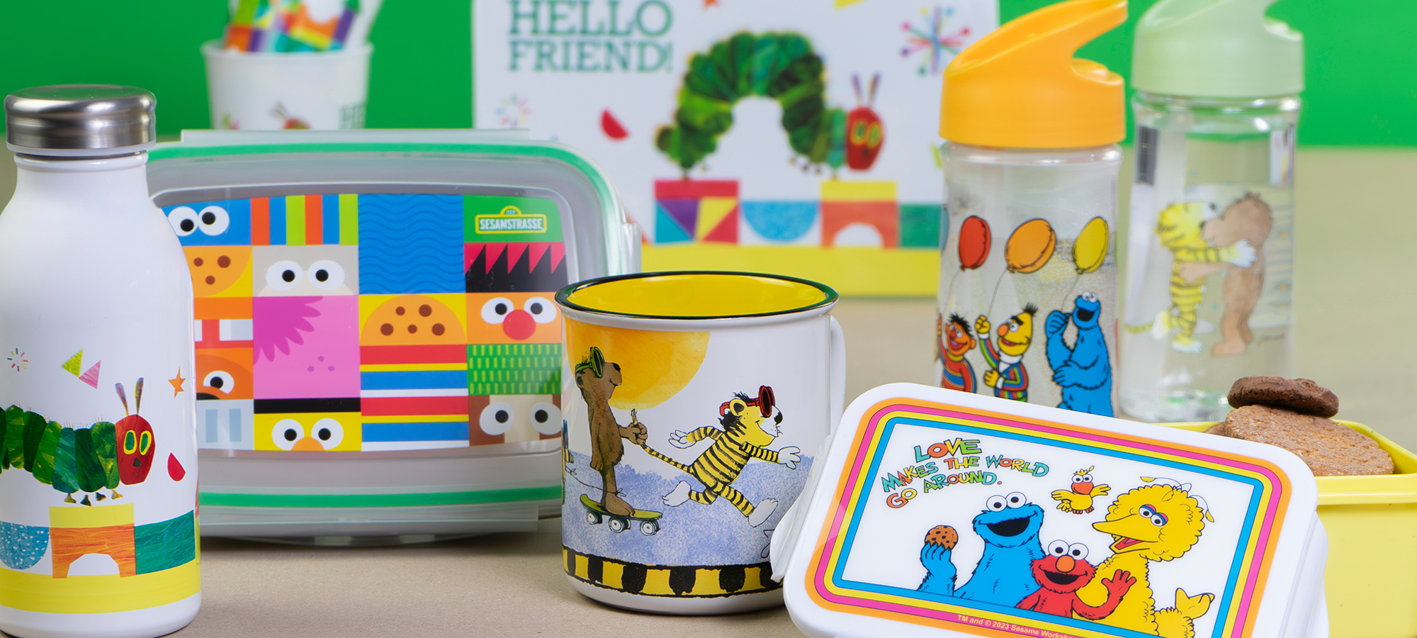 Speziell für kleine Hände designt: farbenfrohes Geschirr aus PP oder Porzellan, das Mahlzeiten zum Erlebnis macht und dabei Kinder spielerisch von ihren Zeichentrick-Helden beim Essen begleitet werden.