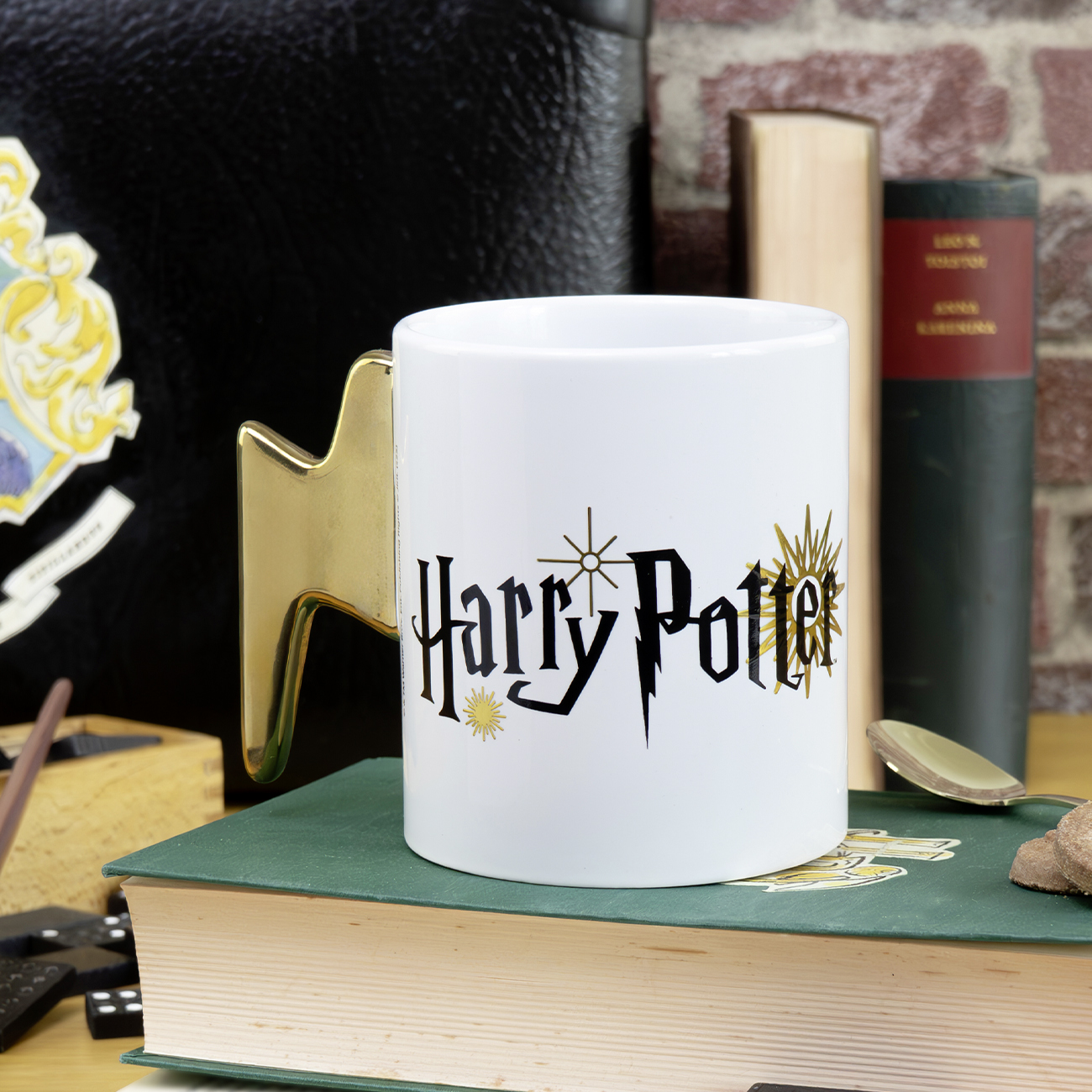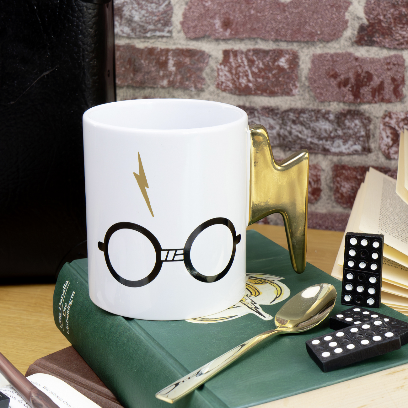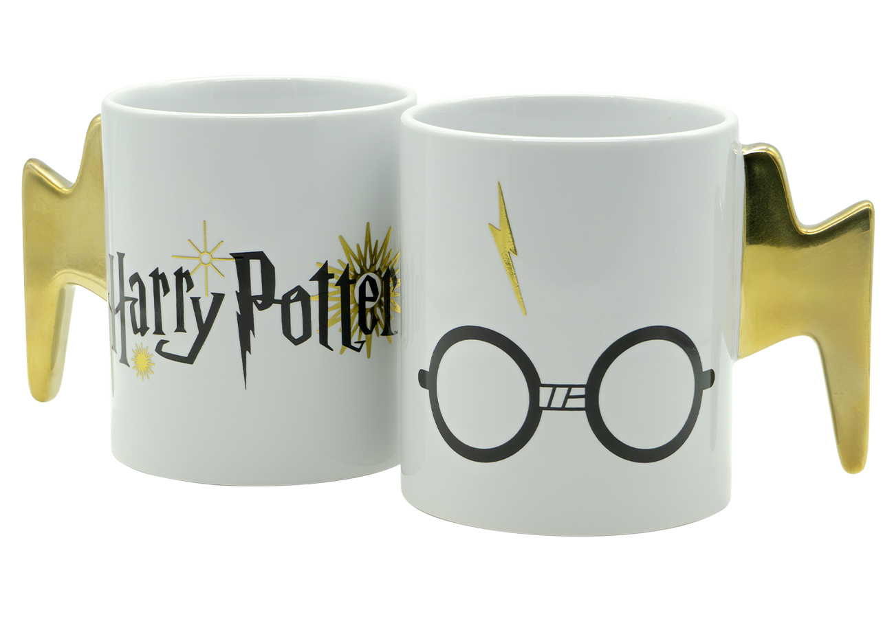 Diese Harry Potter Tasse schlägt ein, wie ein Blitz. Die Tasse mit dem originellen Griff, in Form von einem Blitz, ist ein absoluter Hingucker. Das Design mit der Brille und dem Blitz sowie dem rückseitigen Harry Potter Schriftzug lässt nicht nur das Herz eingefleischter Potter-Fans höher schlagen. Damit der goldene Glanz länger erstrahlt, darf die Tasse weder in die Spülmaschine noch in die Mikrowelle.