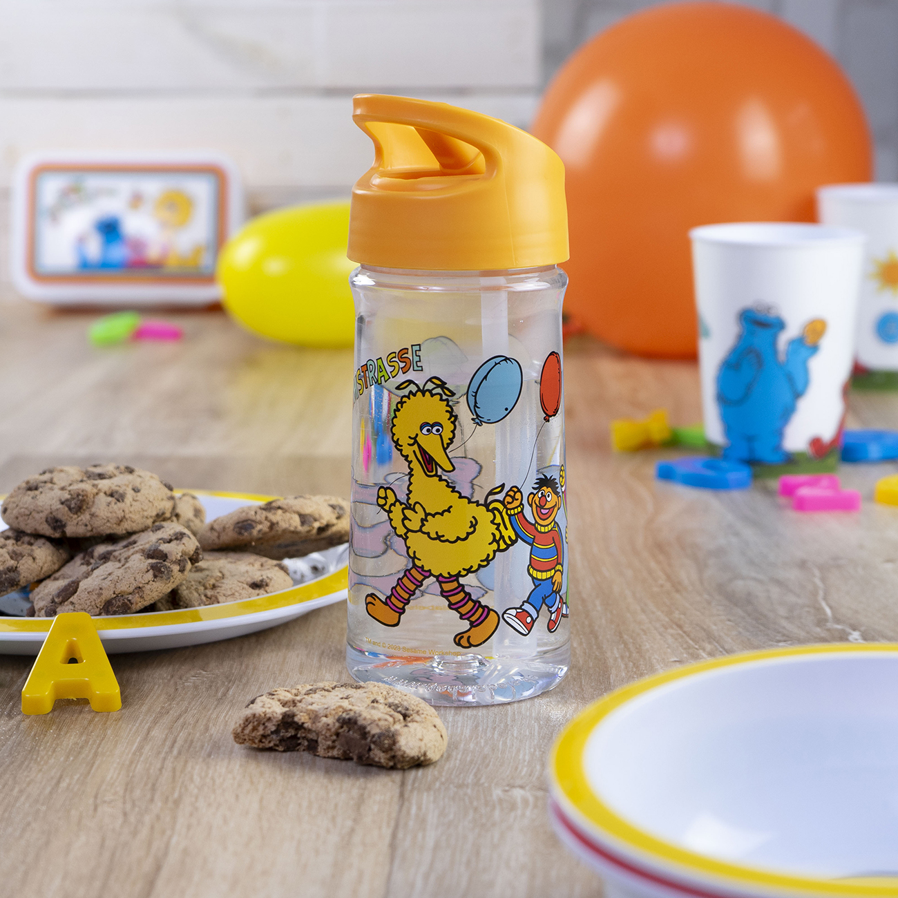 Die Trinkflasche Sesamstraße Classic moments hat einen leuchtend orangen Schraubdeckelverschluss mit integriertem Trinkhalm. Auf dem transparenten Flaschenkörper laufen Ernie und Bert, Bibo, Elmo und das Krümelmonster mit fröhlich bunten Ballons in einer Reihe . Durch den Gummiring und die raffinierte Klapptechnik des Strohhalms ist die Trinkflasche auslaufsicher und durch das verwendete Material Tritan bruchfest. Mit einer Füllmenge von 370ml und befüllt mit Fruchtsaftgetränken, Wasser oder kaltem Tee ist die Flasche ein idealer Begleiter und stillt auch mal den kleinen Durst zwischendurch. Die praktische Schlaufe am Deckel ermöglicht kleinen Kinderhänden einen problemlosen Umgang.