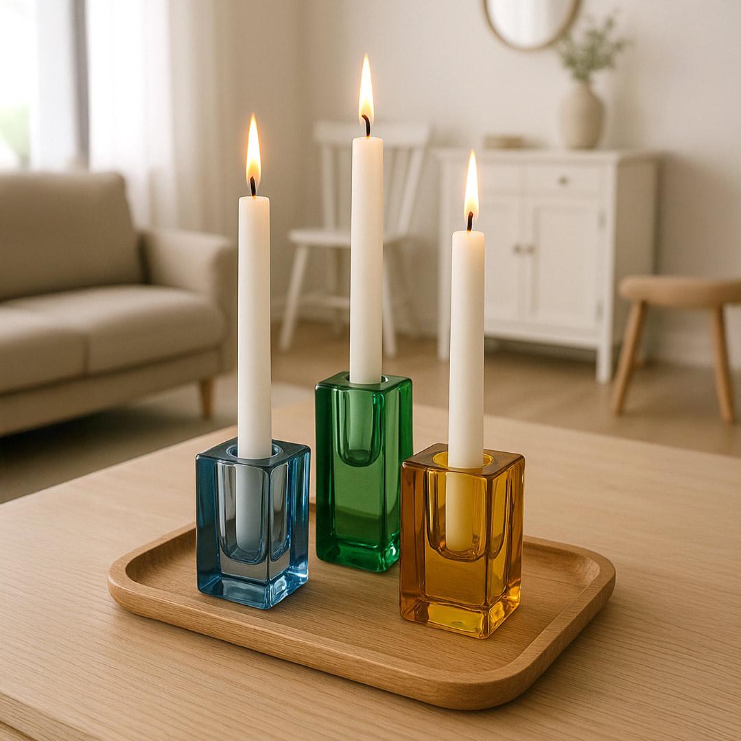 Drei brennende weiße Kerzen in blauen, grünen und bernsteinfarbenen Glashaltern stehen auf einem Holztablett auf einem hellen Holztisch in einem gemütlichen, sanft beleuchteten Wohnzimmer mit neutralen Möbeln im Hintergrund.