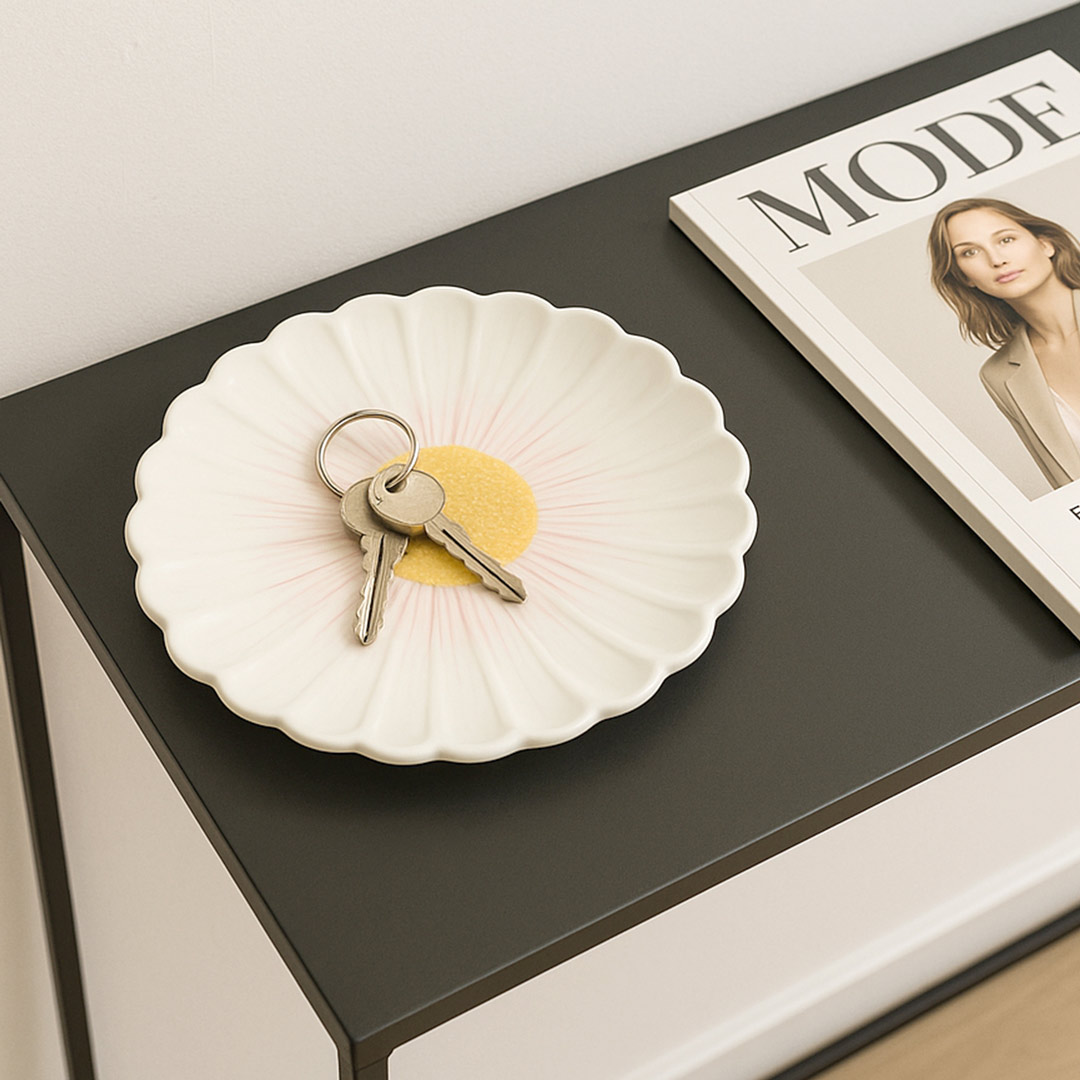 Eine weiße Gänseblümchenschale mit einem Schlüsselbund steht auf einem schwarzen Tisch neben einer Modezeitschrift mit einer Frau auf dem Cover.
